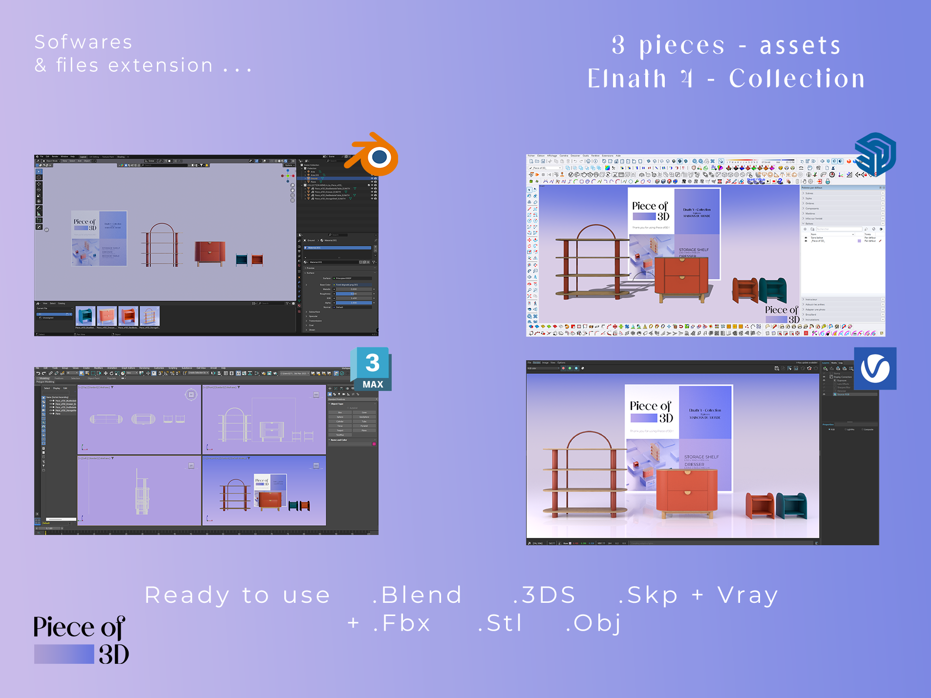 One file items with 3 pieces of the collection. Ready to use on : .Blend (with assets Library) /.SKp+Vray / .3Ds Other formats : .stl / .obj / .fbx