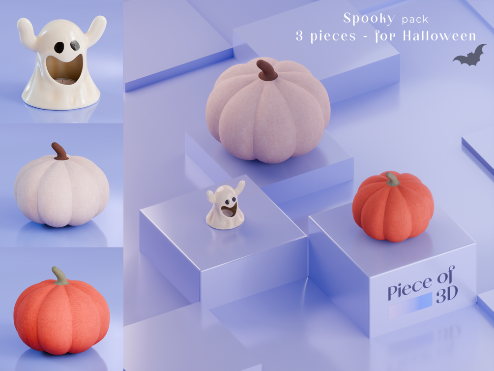 3D Objects - SPOOKY PACK, Halloween special - 3 pieces - Pumpkin pillows & Ghost candle holder